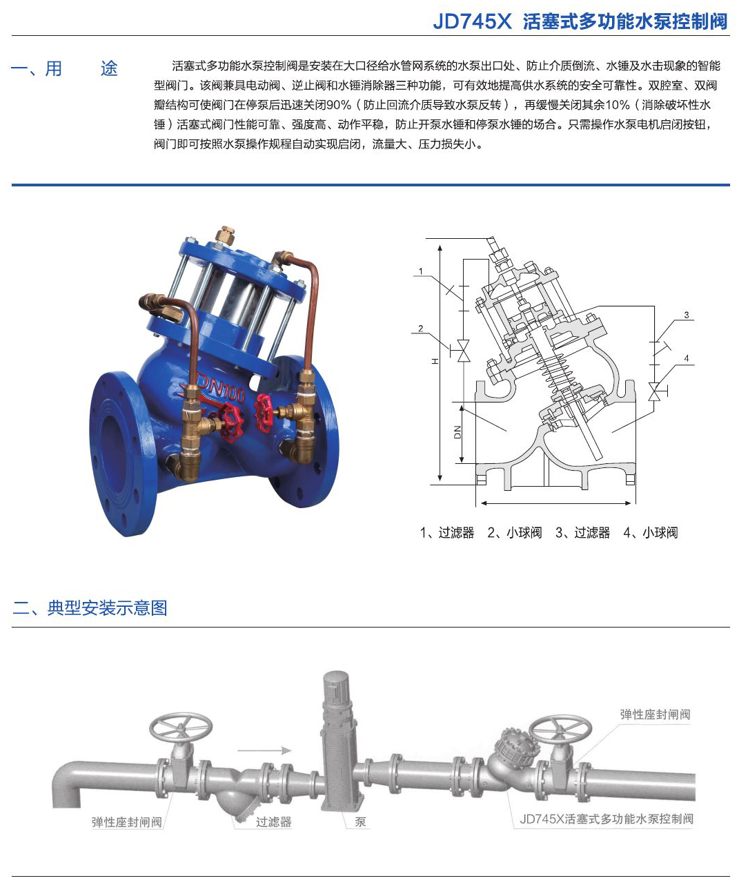 安裝在大口徑給水管網(wǎng)系統(tǒng)的水泵出口處、防止介質(zhì)倒流、水錘及水擊現(xiàn)象的智能型閥門。