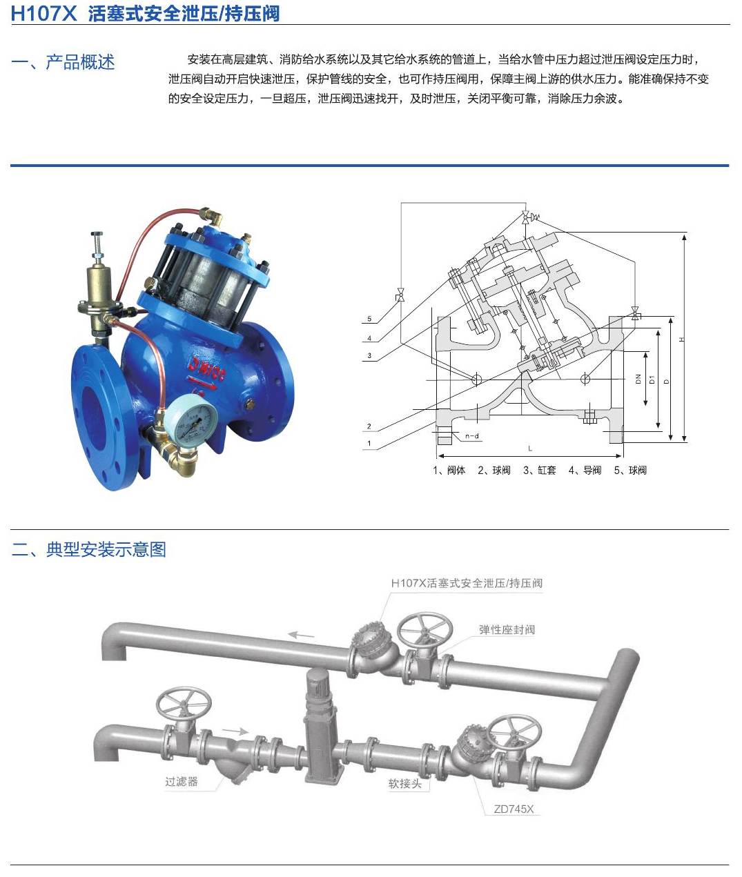 安裝于高層建筑、消防給水系統(tǒng)以及其它給水系統(tǒng)的管道上,當(dāng)給水管中壓力超過泄壓閥設(shè)定壓力時,泄壓閥自動開啟快速泄壓,保護(hù)管線的安全,也可作持壓閥用,保障主閥上游的供水壓力。