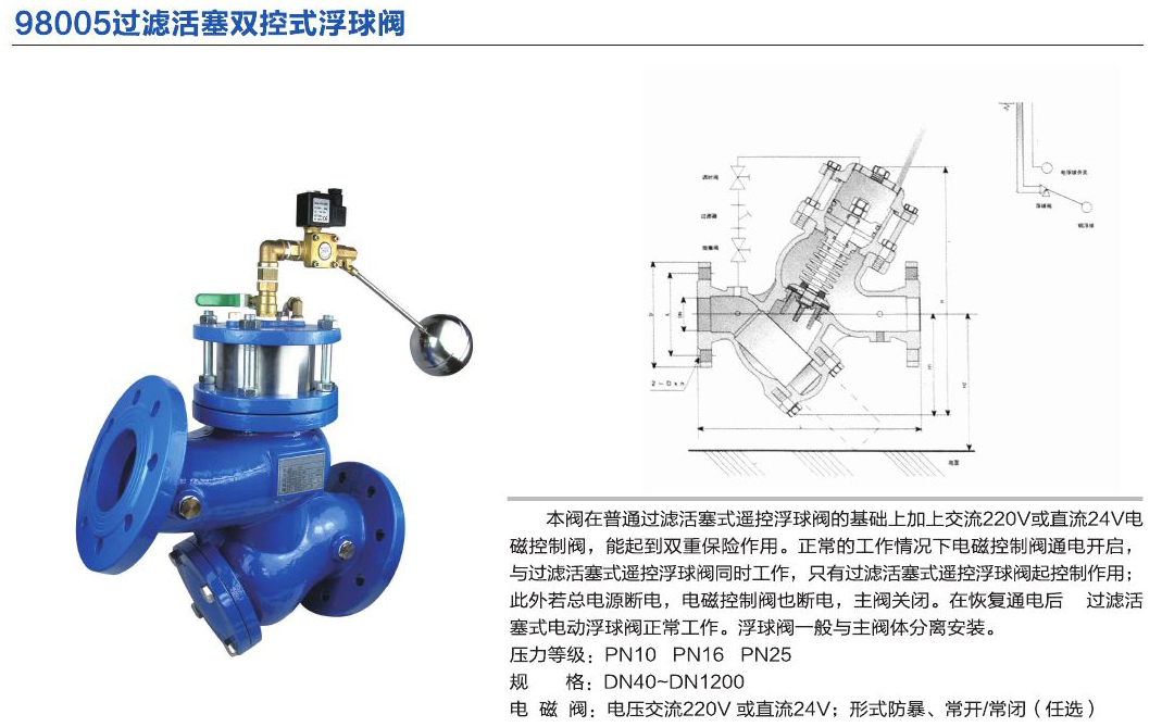 本閥在普通過濾活塞式遙控浮球閥的基礎(chǔ)上加上交流220V或直流24V電磁控制閥,能起到雙重保險作用。