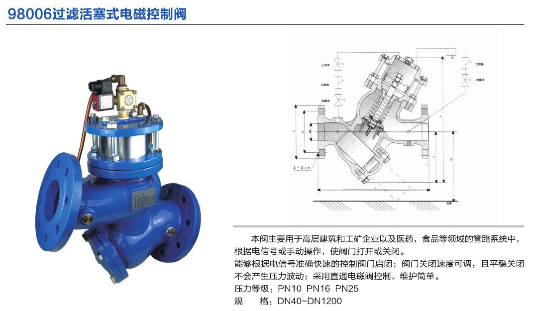本閥主要用于高層建筑和工礦企業(yè)以及醫(yī)藥,食品等領域的管路系統(tǒng)中,根據(jù)電信號或手動操作,使閥門打開或關閉。
