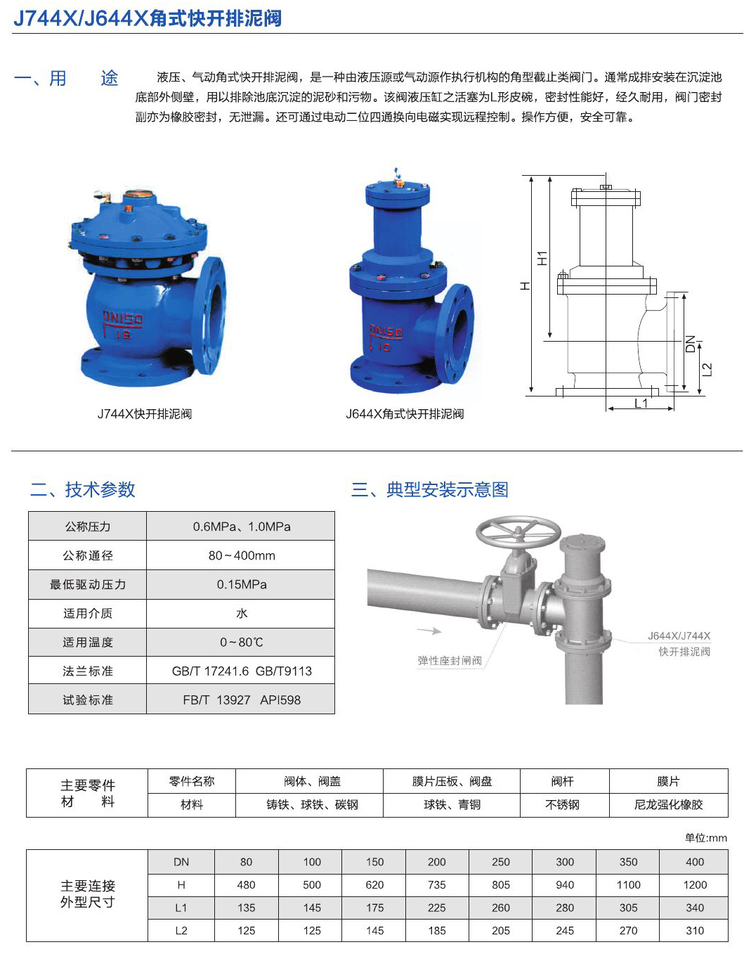 液壓、氣動(dòng)角式快開排泥閥,是一種由液壓源或氣動(dòng)源作執(zhí)行機(jī)構(gòu)的角型截止類閥門。通常成排安裝在沉淀池底部外側(cè)壁,用以排除澉底沉淀的泥砂和污物。