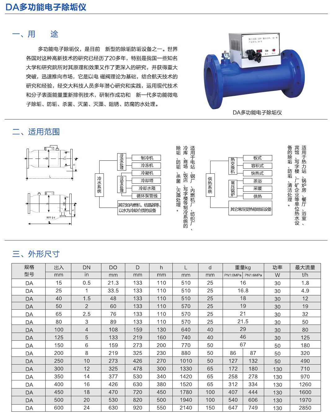 - 多功能電子除垢儀,是目前新型的除垢防垢設(shè)備之一。世界各國對這種高新技術(shù)的研究已經(jīng)歷了20多年,特別是我國一些知名大學和研究院所對其原理和效果又作了更深入的研究,并獲得重大突破,迅速推向市場,它是以電磁閥理念經(jīng)為基礎(chǔ),結(jié)合航天技術(shù)的和經(jīng)驗,經(jīng)交大科技人員多年潛心研究和實踐,運用現(xiàn)代技術(shù)和分子表面能量重新排例技術(shù),研制作成功和新一代多功能微電子除垢、防垢、殺菌、來菌、來藻、陰銹、防腐的水處理。