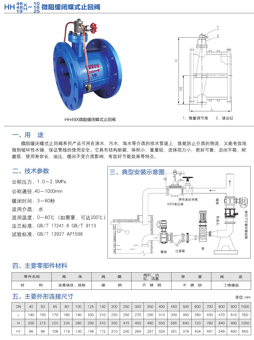 微阻緩閉蝶式止回閥系列產品可用在清水、污水、海水等介質的排水管道上,既能防止介質的倒流,又能有效地限制破壞性水錘,保證管線的使用安全。