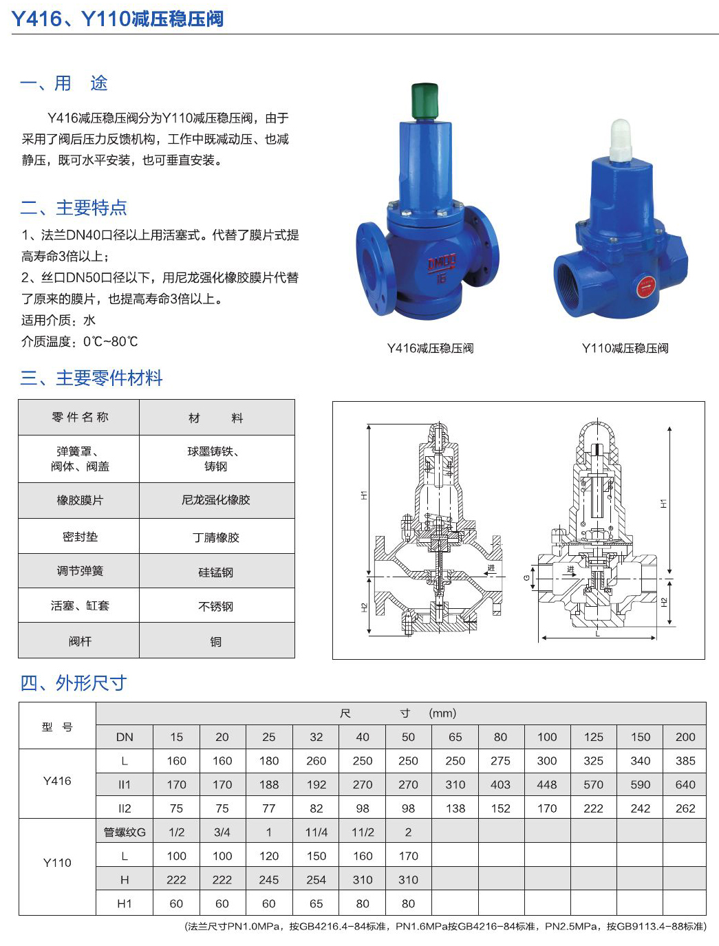 Y416減壓穩(wěn)壓閥分為Y110減壓穩(wěn)壓閥,由于采用了閥后壓力反饋機構(gòu),工作中既減動壓、也減靜壓,既可水平安裝,也可垂直安裝。