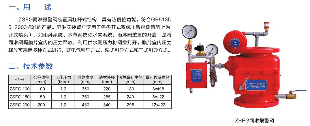 ZSFG雨淋報(bào)警閥裝置屬杠桿式結(jié)構(gòu),具有防復(fù)位功能,符合GB5135.5-2003標(biāo)準(zhǔn)的產(chǎn)品。雨淋閥裝置廣泛用于各類開式系統(tǒng),如雨淋系統(tǒng)、水幕系統(tǒng)和水霧系統(tǒng)。