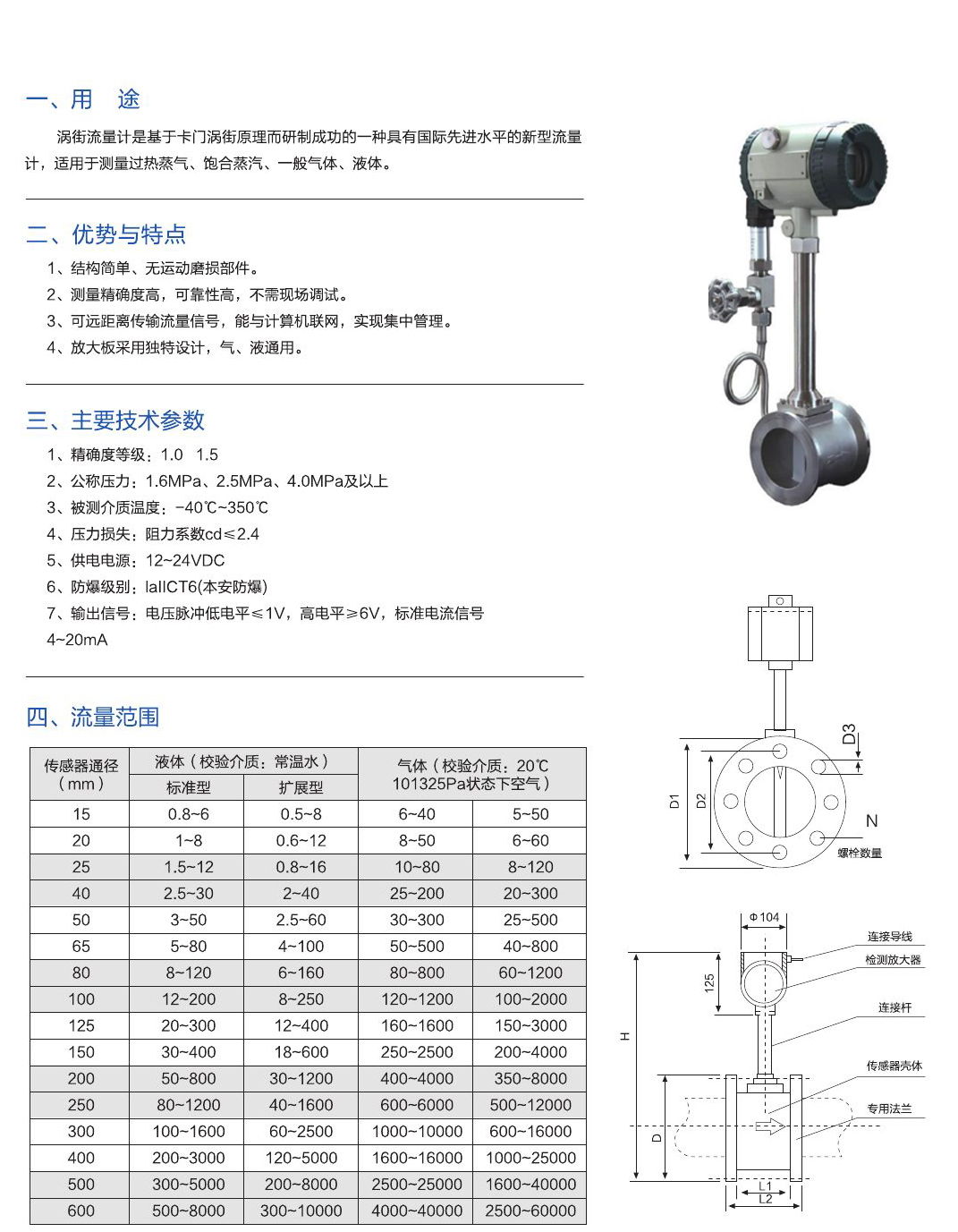 渦街流量計(jì)是基于卡門(mén)渦街原理而研制成功的一種具有國(guó)際先進(jìn)水平的新型流量計(jì),適用于測(cè)量過(guò)熱蒸氣、飽合蒸汽、一般氣體、液體。
