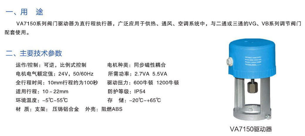 VA7150系列閥門驅(qū)動(dòng)器為直行程執(zhí)行器,廣泛應(yīng)用于供熱、通風(fēng)、空調(diào)系統(tǒng)中,與二通或三通的VG、VB系列調(diào)節(jié)閥門配套使用。