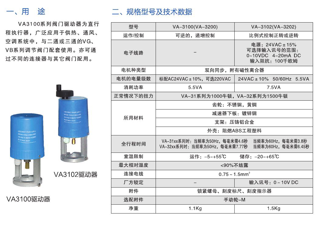 VA3102系列閥門驅(qū)動(dòng)器為直行程掃行器,廣泛應(yīng)用于供熱、通風(fēng)、空調(diào)系統(tǒng)中,與二通或三通的VG、VB系列調(diào)節(jié)閥門配套使用。