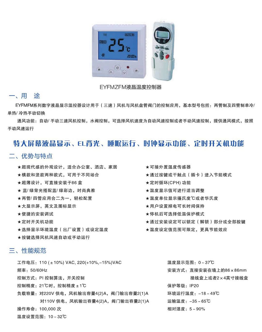 LGDZFM系列數(shù)字液晶顯示溫控器設(shè)計(jì)用于(三速)風(fēng)機(jī)與風(fēng)機(jī)盤管閥門的控制應(yīng)用,基本型號(hào)包括:兩管制及四管制單冷/單熱/冷熱手動(dòng)切換